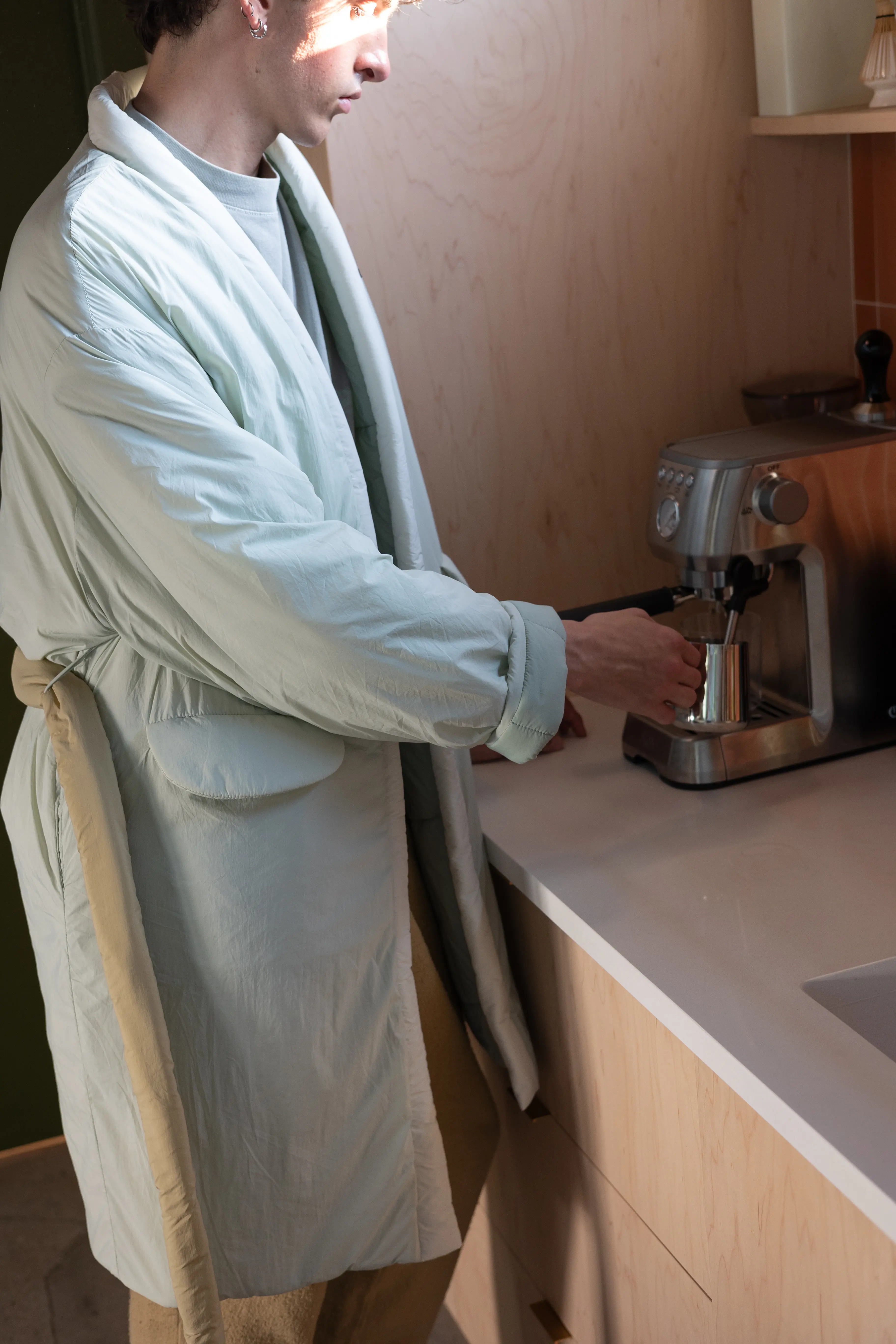 Crafted from lightweight nylon, this robe offers a tactile experience that's cool to the touch, designed to shield you from the elements without compromising on warmth and comfort